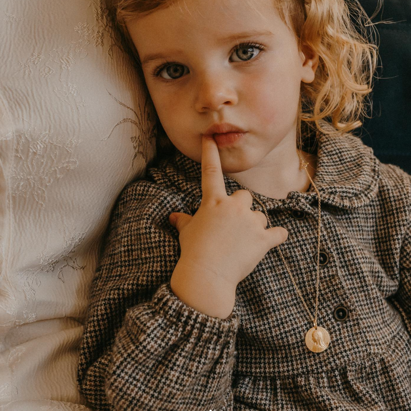 La médaille est le bijou le plus prisé pour un baptême, une première communion ou une confirmation, voire une profession de foi. Elle se présente sous la forme d'un disque en or ou en argent fixé au cou par une chaîne du même métal. La médaille est enfilée en pendentif et arbore l'effigie d'un personnage emblématique de la religion catholique. On retrouve habituellement des personnages tels que Jésus-Christ ou la Vierge Marie. Les anges, les saints et la colombe figurent également parmi les modèles les plus répandus.