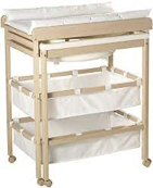 La table à langer Roba est combinée avec une baignoire et des étagères de rangements. La baignoire se vide grâce à untuyau d’évacuation fourni, elle se range ensuite sous l’espace de lange. Les filets de rangements sont imperméables et facilement nettoyables. La table à langer est également munie de roulettes pour faciliter son déplacement. Le meuble mesure 83 cm de hauteur, 56 cm de largeur et 100 cm de profondeur. Son prix est de 181,04 €.