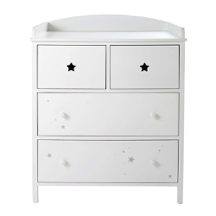 La commode à langer SONGE est dotée de 4 tiroirs et d’un grand plateau avec des rebords de sécurité dédié pour le change de bébé. Les poignées en forme d'étoiles sur les deux premiers tiroirs font toute la différence ! Sa dimension est de 104 cm de haut, 85 cm de large et 72 cm de profondeur. Son prix est de 359 €.