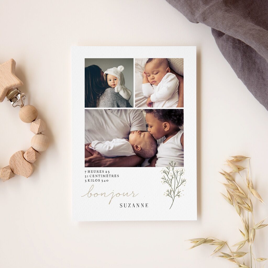 Concernant les photos, il n’y a pas vraiment de règle, c’est un choix qui vous revient. Vous pouvez mettre une ou plusieurs photos de votre bébé sur le faire-part (ce que font la majorité des couples) ou bien choisir un faire-part sobre et épuré sans aucune photo.