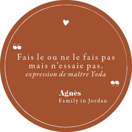Bonjour, je m’appelle Agnès et je suis maman de 3 enfants (avec le papa Nicolas). Eneko notre aîné a 9 ans, son frère Anton bientôt 7 et la petite sœur Amaya 3 ans ½. Nous vivons en Jordanie depuis 20 mois.