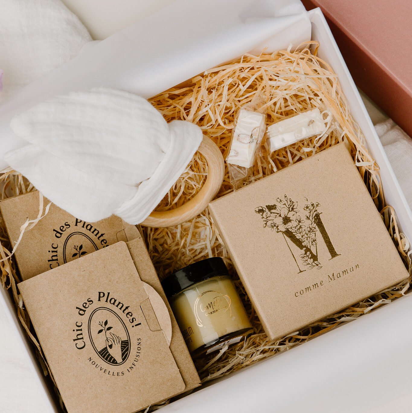 Vous découvrirez à l'intérieur de ce coffret de grossesse un baume de massage, un assortiment de tisanes, une délicate carte “je t’attends mon bébé”, un bola de grossesse à choisir parmi la très belle gamme de atelier Aismée, un anneau de dentition de la couleur de votre choix. Vous pourrez également ajouter un carnet de grossesse, des cartes étapes, un bracelet papa ou grand frère, grande sœur. Un cadeau unique et personnalisable comme bon vous semble en ajoutant les produits qui vous semble les plus pertinents. Une box incroyable qui a de quoi faire jalouser certaines futures mamans…
