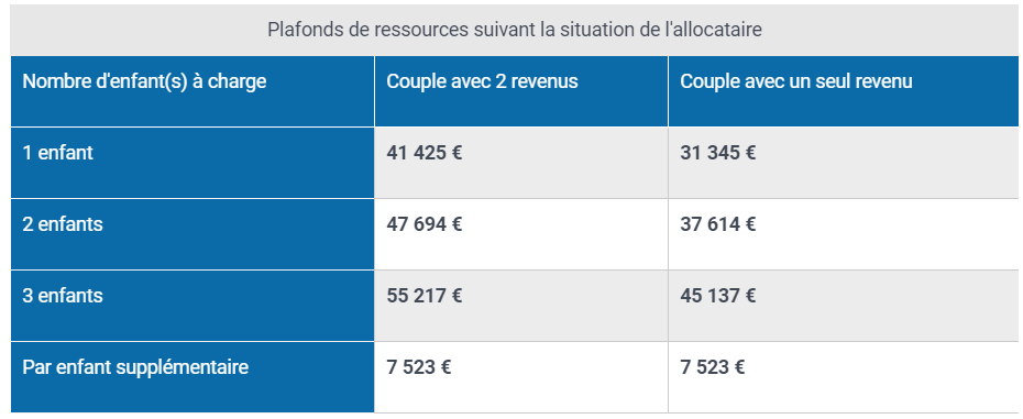 Encore de la paperasse mais pour la bonne cause ! Après cela, votre CAF va se baser sur vos revenus antérieurs (qu'elle récupère directement auprès des impôts) puisqu'il y a des plafonds à ne pas dépasser pour avoir droit à ce versement. Voici deux tableaux récapitulatifs de ces plafonds en fonction de votre situation :